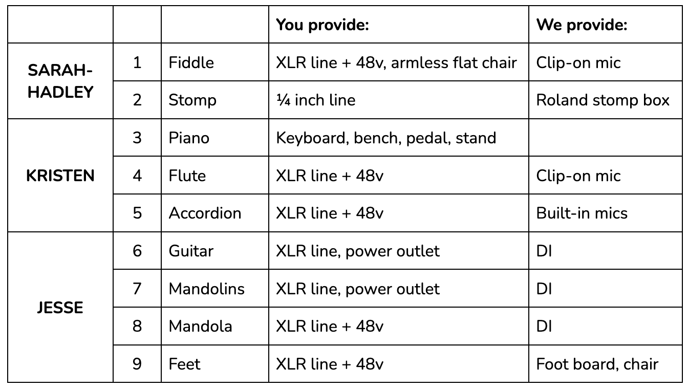 The band requires a minimum of three monitors with individual mixes. A power strip or power conditioner with a proper ground must be provided to supply power to the band’s equipment. A minimum of three outlets are needed. We sometimes don’t bring mandola; please check with us if that’s an important detail to confirm.